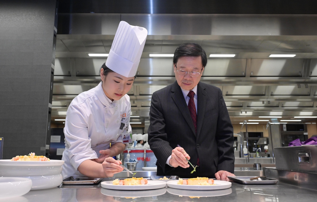 李家超(右)在學員的指導下,學習為菜式擺盤。政府新聞處圖片 李家超一行在職訓局主席戴澤棠和職訓局前主席、立法會主席梁君彥等陪同下,先後參觀學院的廚藝館、研習酒窖、茶座、甜品及麵包製作工房等培訓設施,並與不同學員交流,了解他們的學習情況和對投身行業發展的願景。 李家超“探班”期間,獲香港國際美食大獎25歲以下“海鮮組”銀牌得獎學員黃湘教擺盤藝術,為她的作品來個“終極點綴”。李家超指,黃湘同學製作的蛋糕以粟米為主題,乍看似是一道甜品,細心品嘗後才發現原來是咸味的創意小點!黃湘分享希望成為廚師的憧憬和計劃,李家超鼓勵她要繼續努力,要對自己的廚藝和創意有信心。而其他同學亦各有夢想,例如計劃在畢業後投身酒店餐飲業、成為點心師傅、朱古力師,甚至開店發展葡萄酒事業等。李家超表示,很高興看到同學們都積極為自己的目標而奮鬥着。 李家超指,香港有很多全日制、兼讀制,以及在職培訓的課程提供給各年齡層人士選擇,發展不同技能,投身不同行業。他很高興聽見學員從不同領域的課程中都獲益不少,不但找到自己有興趣發展的技能,還提升了全人發展和應變能力。李家超表示,政府未來會繼續吸引更多年青人加入學徒訓練,並鼓勵畢業學徒留在行業作長遠發展。正所謂“行行出狀元”,只要有熱誠,加以努力,任何人也可以在不同的行業中闖出一片天。香港是一個多元化的國際城市,需要不同專長的人在各行業共展所長,提升香港競爭力、活力、魅力!