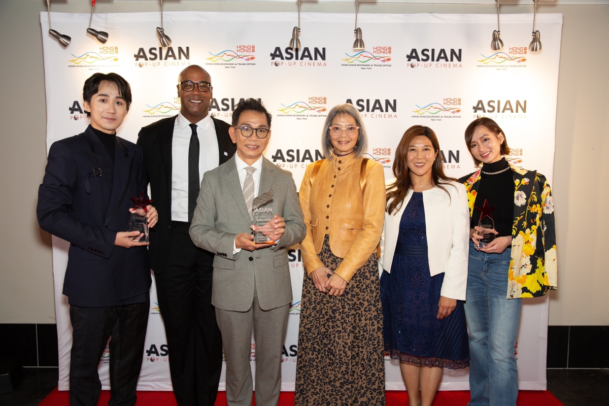 圖示(左起)吳肇軒、Glenn Eden、袁富華、王曉菲、何美智,與梁雍婷。 亞洲躍動電影節香港影片展和頒獎禮由香港駐紐約經濟貿易辦事處贊助。今季選映了五部香港作品,包括《說笑之人》、《白日之下》、《不日成婚2》、《死屍死時四十四》和《把幸福拉近一點》。