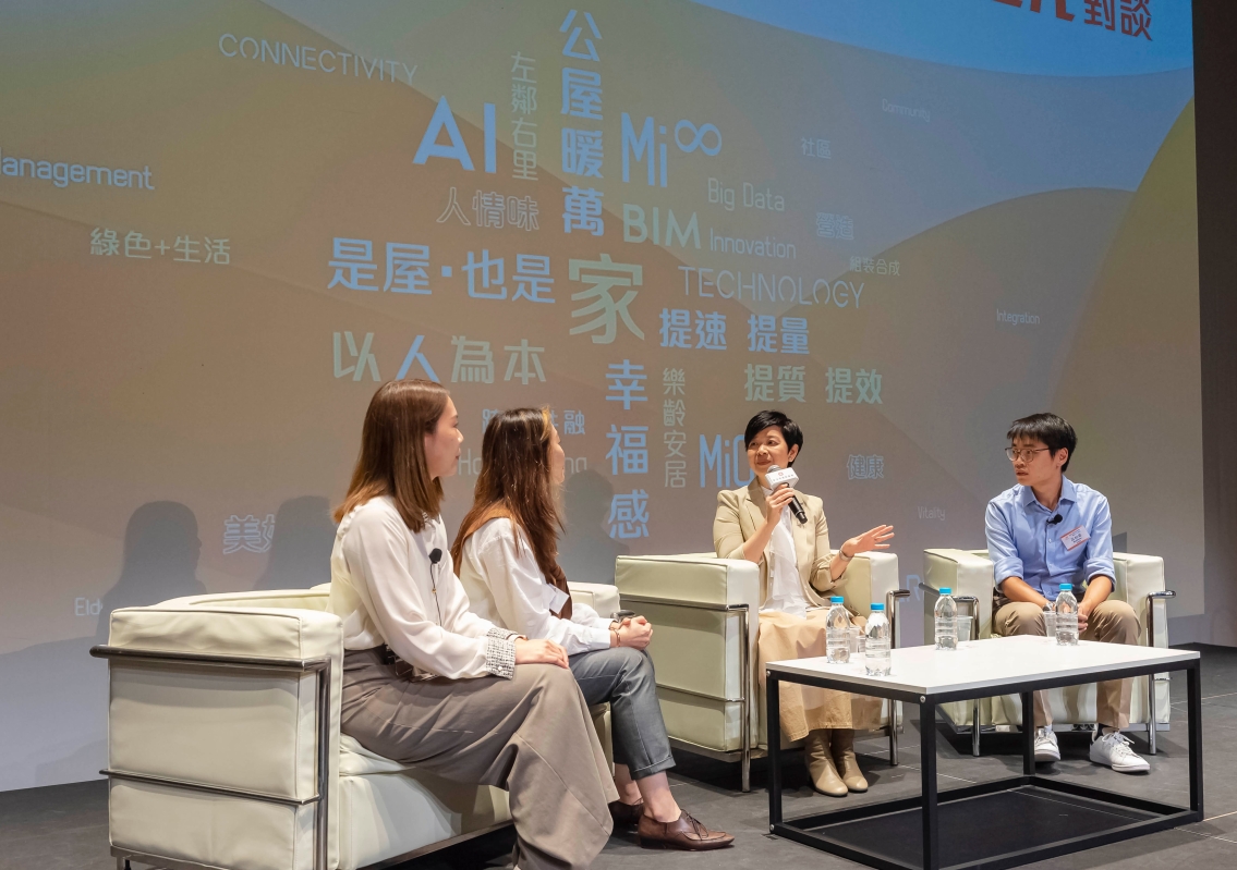 房屋局局長何永賢(右二)於“‘香港公營房屋發展’——與新世代對談”講座上,與年輕專業人士共同探討未來公營房屋的發展。 馮宜萱指出:“公營房屋發展在追求善用科技及創新設計之餘,質素先行無疑是基本原則。” 鄭寶鴻認為:“公屋一直是基層市民安居樂業之所,屋邨生活洋溢濃厚人情味。現在公屋居民生活方式改變了,屋邨管理工作也變得多元化,與時並進。” “‘香港公營房屋發展’——與新世代對談”是房委會成立50周年的慶祝活動之一,共分三個環節,包括:(一)與局長“對談”:迎難而上——公營房屋發展新里程與香港未來;(二)與前輩“對談”:承先啟後──探索未來公營房屋設計與建造方向;以及(三)與掌故專家“對談”:本土情懷——重拾公屋人、物、情。 對談講座於柴灣青年廣場舉行,吸引了200多位年青專業人士及大專院校學生出席。講者分享了公營房屋的發展方向、設計建造及人情風貌等,隨着時代變遷而出現不同演變。他們勉勵已加入房屋署團隊或準備投身房屋事務工作的青年人,堅守以人為本的信念面對困難和挑戰。