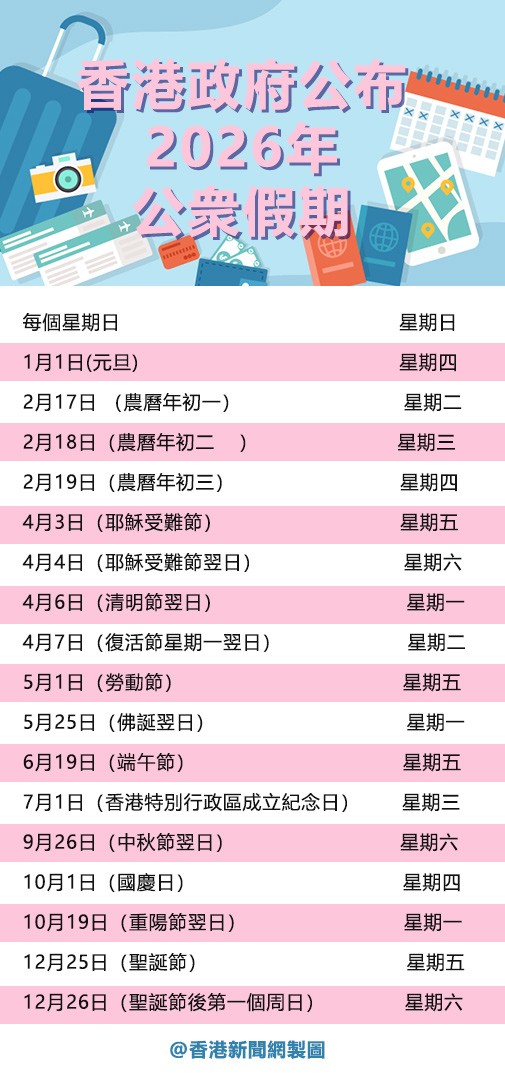 香港政府公布2026年公眾假期