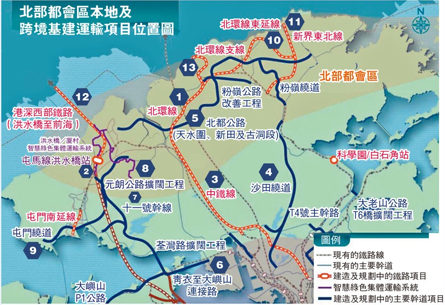 在交通規劃方面,香港特區政府擬建11條本地運輸基建項目,包括北環線、北環線東延線、新界東北線、北都公路等,以及港深西部鐵路(洪水橋至前海)及北環線支線兩條跨境基建項目,其中北都公路勘查工程的原預算,由約11.3億元減至約6.8億元,新田段的勘查時間亦由38個月縮短至25個月。