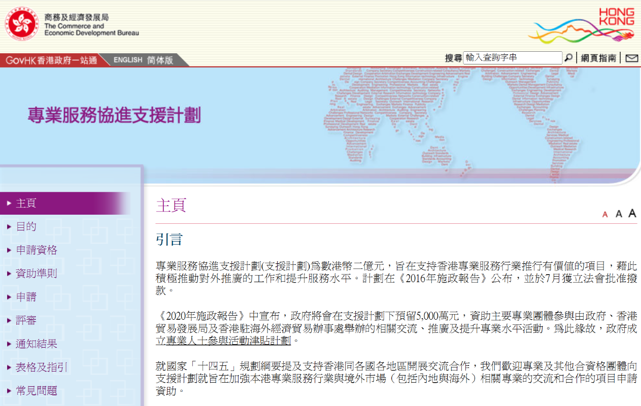 為數2億港元的支援計劃旨在資助由業界主導的非牟利項目,以加強香港專業服務行業與境外同業的交流和合作、推動相關宣傳活動,以及提高香港專業服務水平和對外競爭力。
