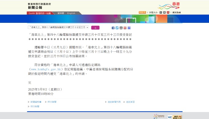 符合資格的“港車北上”申請人可透過指定網站登記電腦抽籤。中籤者須在指定時間內遞交“港車北上”的申請。(完)