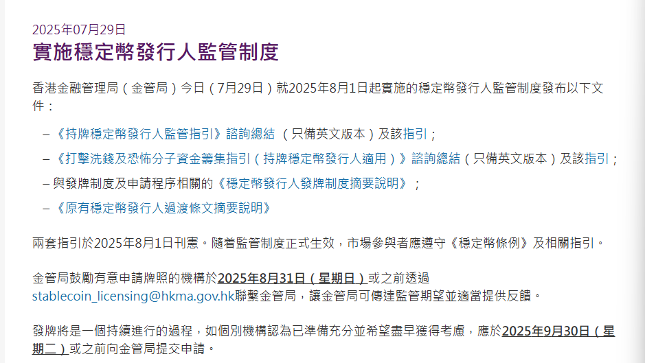 香港新聞網7月30日電  香港金融管理局發佈持牌穩定幣發行人監管制度系列指引(簡稱“指引”),提出法定穩定幣的定義,明確發行人牌照申請的財務條件、人員資質、儲備資產、風險管理和監管要求等。香港金管局表示,截至7月29日,香港金管局尚未發出任何牌照,并鼓勵有意申請牌照的機構於2025年8月31日或之前聯繫金管局。