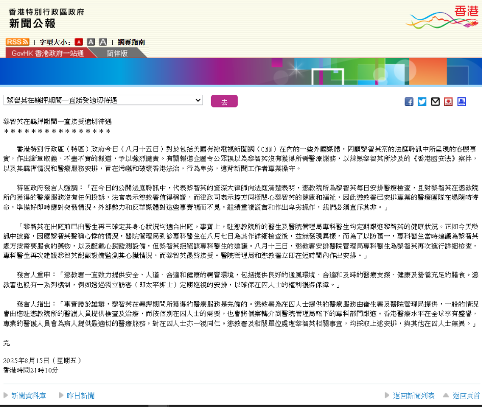 “黎智英在出庭前已由醫生再三確定其身心狀況均適合出庭。事實上,駐懲教院所的醫生及醫院管理局專科醫生均定期跟進黎智英的健康狀況。正如今天聆訊中披露,因應黎智英聲稱心悸的情況,醫院管理局到診專科醫生在8月7日為其作詳細檢查後,並無發現異樣,而為了以防萬一,專科醫生當時建議為黎智英處方按需要服食的藥物,以及配戴心臟監測設備,但黎智英拒絕該專科醫生的建議。8月13日,懲教署安排醫院管理局專科醫生為黎智英再次進行詳細檢查,專科醫生再次建議黎智英配戴設備監測其心臟情況,而黎智英最終接受。醫院管理局和懲教署立即在短時間內作出安排。”