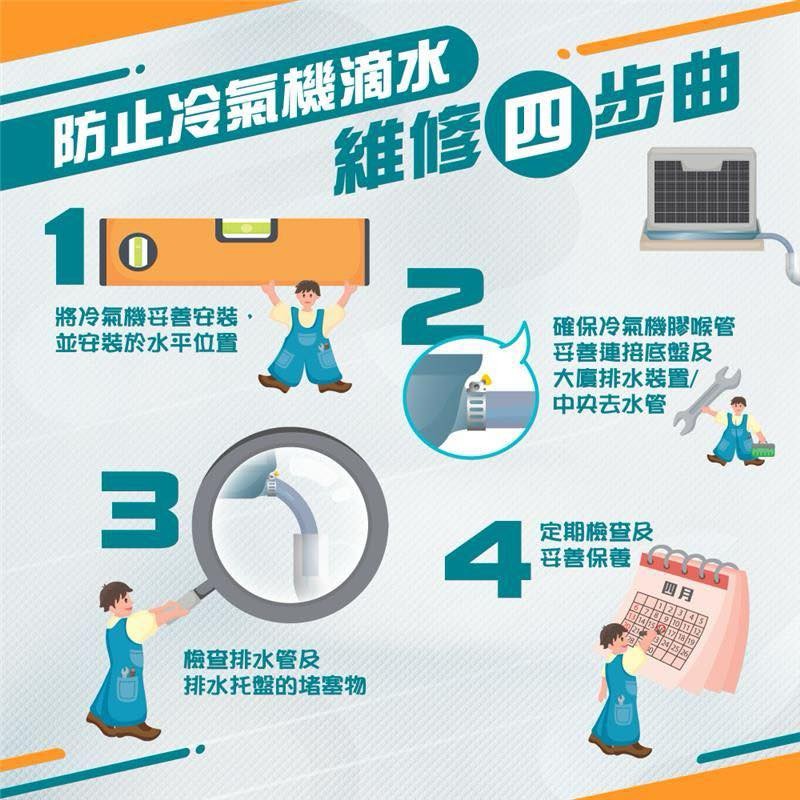 香港新聞網9月4日電 香港特區政府食物環境衞生署4日在社交媒體提醒市民,冷氣機滴水非小事,並列出維修四步曲,呼籲市民要留意。