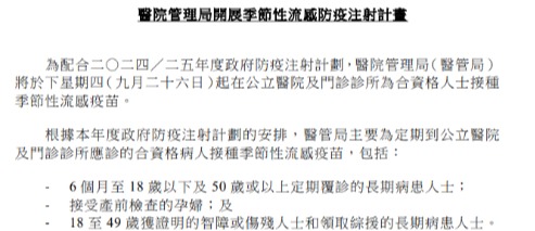 香港中通社9月8日電 香港特區政府衞生署衞生防護8日宣布,2025/26年度季節性流感疫苗接種計劃將於9月25日展開,除了以往合資格免費或獲資助接種季節性流感疫苗的人士外,所有18歲至49歲長期病患人士,不論經濟狀況,本年度亦可接種免費或獲資助流感疫苗。