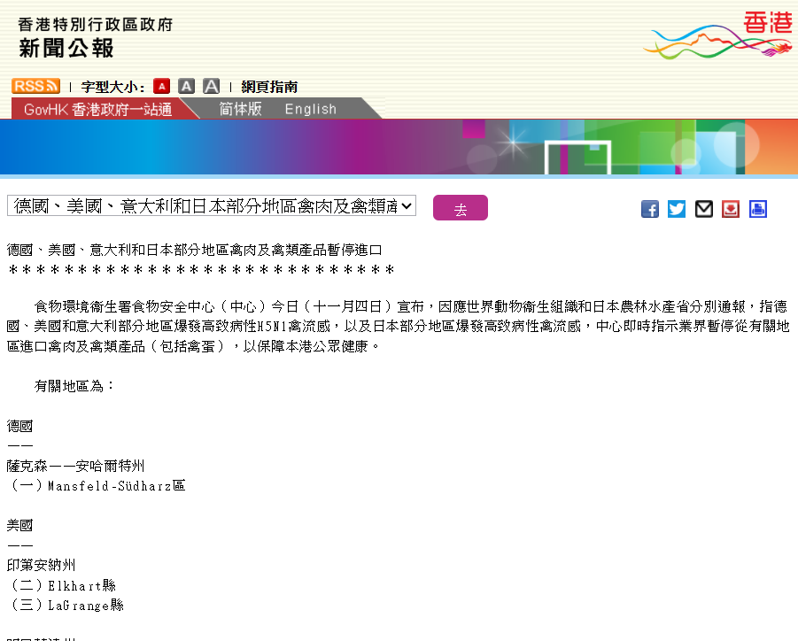 香港暫停進口德美日意部分地區禽肉及禽類產品分享到:
