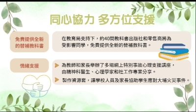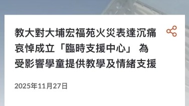 大埔區的教育大學,已制定一系列支援受影響學生和居民的措施:除了主動聯絡居住在宏福苑的師生,以確保他們安全外,亦成立“香港教育大學臨時支援中心”,中心將於每天早上八時半至傍晚六時半開放,開放包括部份室內運動場等校園設施,並招募退休老師、心理學家、校友及正在實習的準教師等,為受火災影響家庭及學童提供臨時的學習空間及情緒方面的支援。 大學已設立輔導熱線,為受影響的師生提供心理及情緒輔導,並委託了教大心理學的專家,為學校教師、學生及家長舉辦線上研討會及工作坊,以協助他們掌握心理支援方面的相關技巧。 另外,香港賽馬會亦會透過“賽馬會緊急援助基金”,由學校協助向每名受影響學生提供五千元以應對即時的學習需要,減低事件對學生的影響。 教育局將在周末為教師及家長舉辦五場網上特別事故心理支援講座,以支援學校人員和家長照顧有創傷經歷的學生/子女,講者包括精神科醫生、心理學家和社工。 如有校舍因火災而受損,教育局會透過緊急修葺工程盡快進行維修,確保校舍安全。(完) 【編輯:陳卓儀】