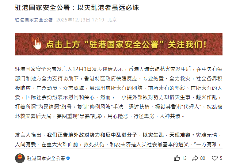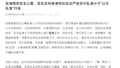 駐港國安公署:以災亂港者雖遠必誅香港新聞網12月3日電 駐港國家安全公署發言人12月3日發表談話表示,香港大埔宏福苑火災發生後,在中央有關部門和地方全力支持協助下,香港特區政府快速反應、專業處置、全力救災,社會各界積極響應、廣泛動員、眾志成城,展現出前所未有的團結、前所未有的堅毅、前所未有的大愛,國際社會紛紛表示慰問和關心。然而,一小撮外部敵對勢力卻借災生事、趁火作亂,打著所謂“為民請願”旗號,複製“修例風波”手法,通過扶植、操縱其香港“代理人”,擾亂破壞救災善後大局,妄圖重現“黑暴”亂象,用心險惡、行徑卑劣、人神共憤。