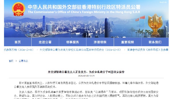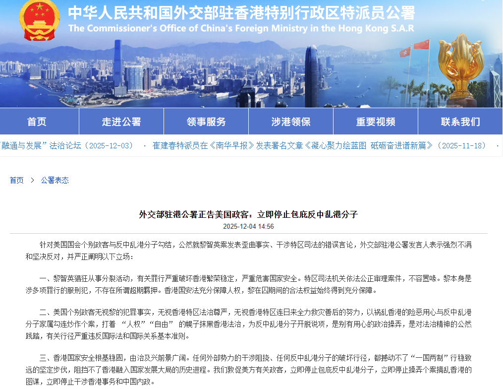 香港新聞網12月4日電 針對美國國會個別政客與反中亂港分子勾結,公然就黎智英案發表歪曲事實、干涉特區司法的錯誤言論,外交部駐港公署發言人4日表示強烈不滿和堅決反對,並嚴正闡明以下立場: