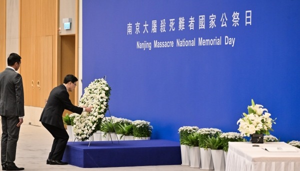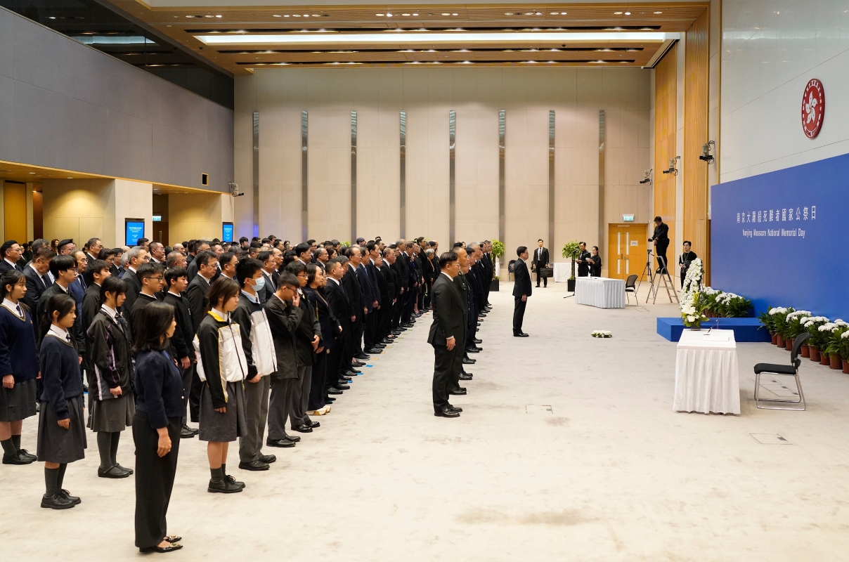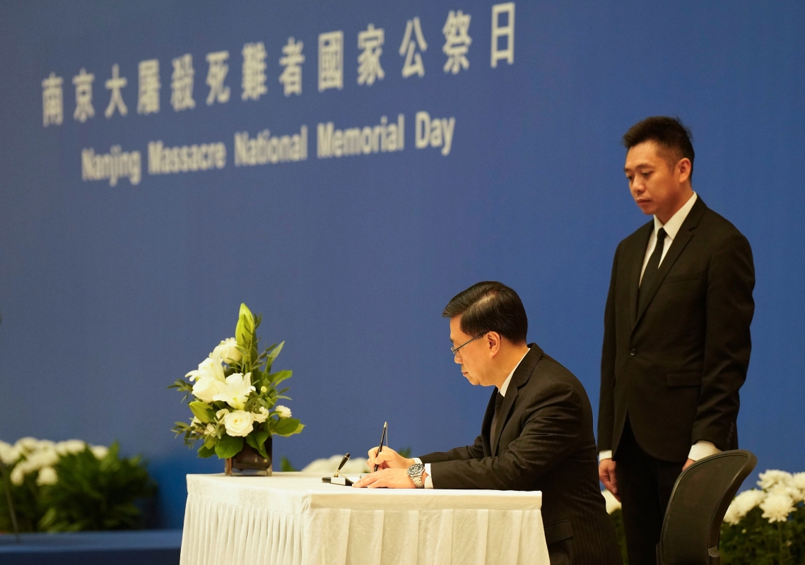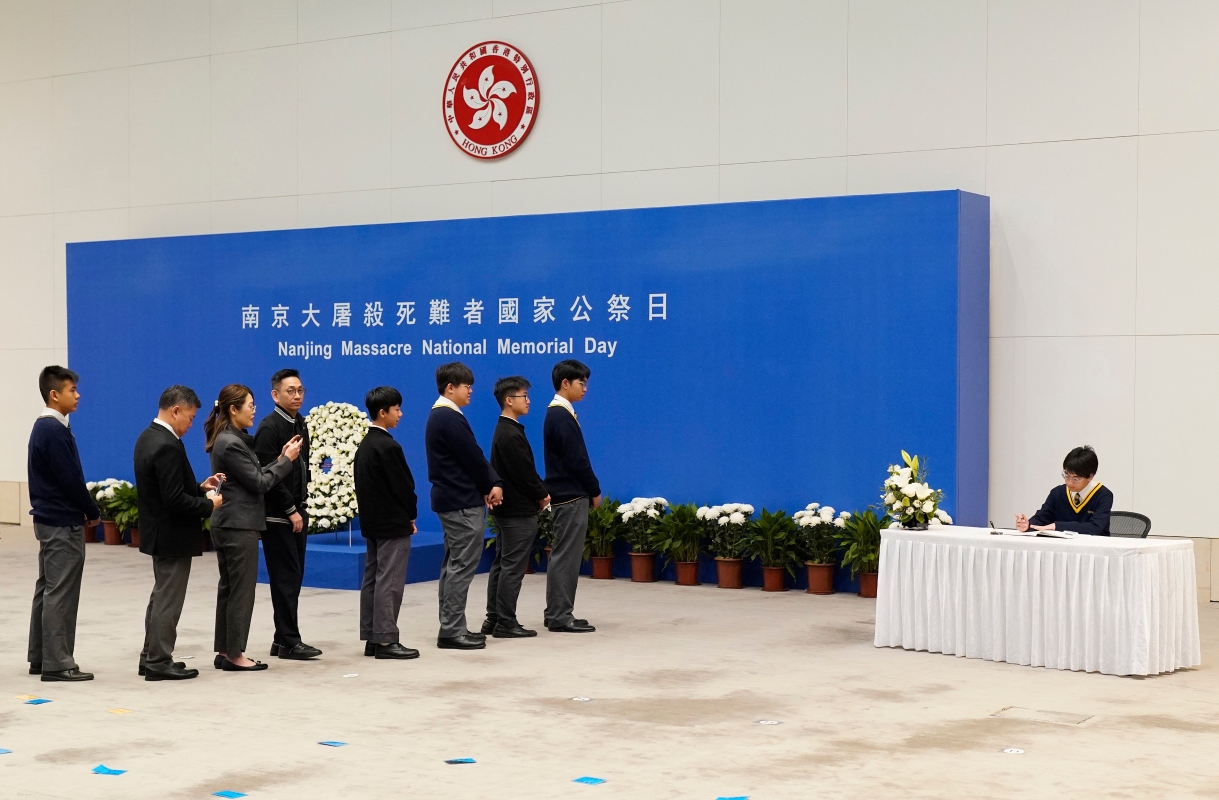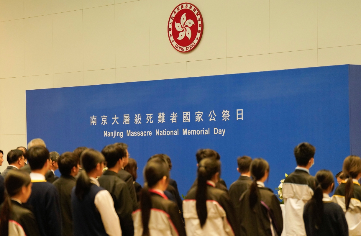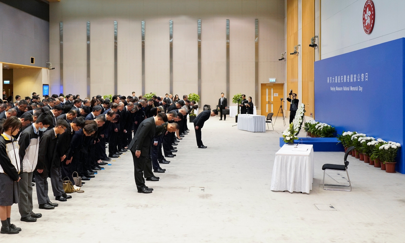 香港新聞網12月13日電(記者陳奕啟)12月13日,南京大屠殺死難者國家公祭日。香港特別行政區政府上午10時於政府總部設立公祭儀式,悼念在事件中遇難的同胞。 行政長官李家超出席儀式,並向死難者致獻花圈。儀式期間,全體人員肅立默哀並行鞠躬禮,學生代表亦參與簽署紀念冊,表達追思之意。前行政長官曾蔭權及林鄭月娥、中央駐港機構代表、特區政府主要官員、司法機構代表、原東江縱隊港九獨立大隊老游擊戰士、退伍軍人代表及學生代表等出席儀式。