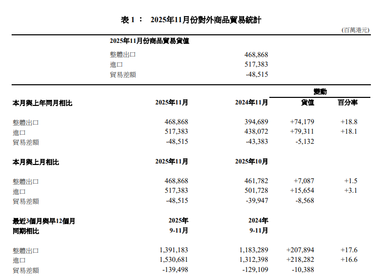 今年首11個月的商品整體出口貨值較2024年同期上升14.3%。同時,商品進口貨值上升14.1%。今年首11個月錄得有形貿易逆差3828億港元,相等於商品進口貨值的7.5%。