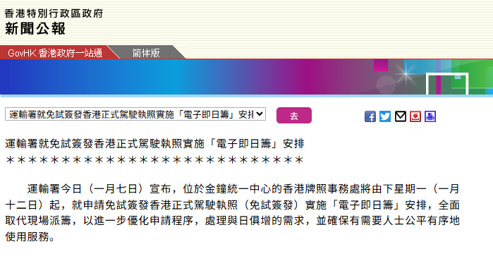 圖片來源:政府新聞處網站截圖 運輸署公佈,由於有人濫用現場派籌安排,為防止免試簽發的輪候影響其他牌證申請,以及優化牌照事務處的秩序管理,署方將由8日起取消免試簽發現場派籌安排。申請人或其代理人由12日起可使用“電子即日籌”線上取號。 此前,運輸署金鐘牌照事務處近日出現“排隊黨”,通宵輪候取籌辦理免試簽發香港駕駛執照。過去三年,以內地駕駛執照獲批免試簽發的申請持續上升,去年逾7.5萬宗,佔89%。 據悉,由於內地司機若想通過“粵車南下”政策進入香港市區自駕,需持有香港駕照,免試簽發申請量近期飆升。(完) 【編輯:林曉惠】