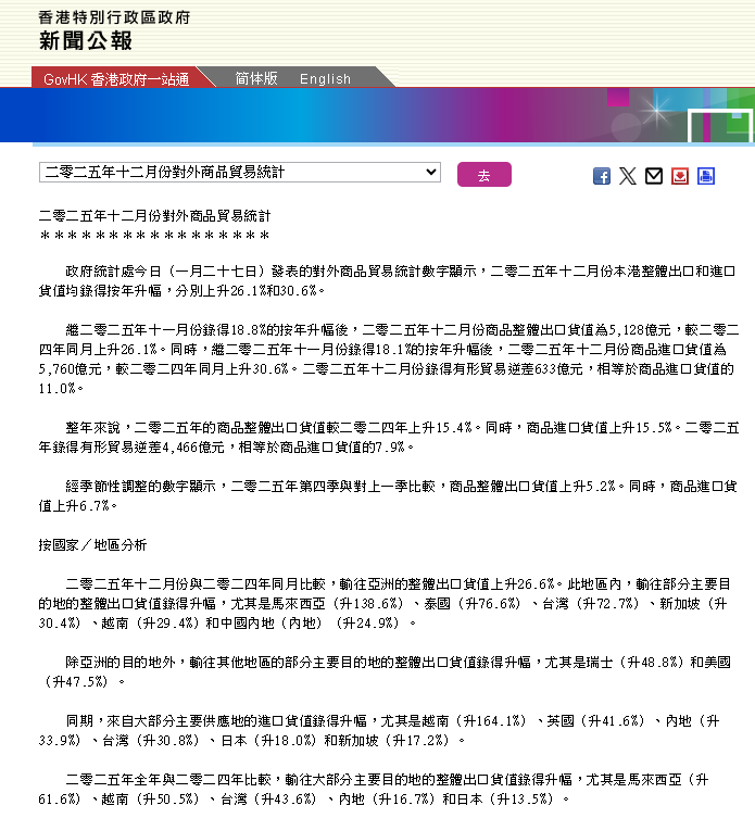 香港新聞網1月27日電 香港特區政府統計處27日公布最新數據指,香港去年商品出口按年升15.4%至52403億元(港元,下同),不僅連續第二年上升,金額更創出歷史新高。 政府發言人表示,環球經濟持續溫和擴張,香港和新興市場的更緊密經貿聯繫,加上全球對人工智能電子相關產品的需求強勁,會支持香港的商品貿易表現,但同時繼續對各種不確定因素保持警覺。