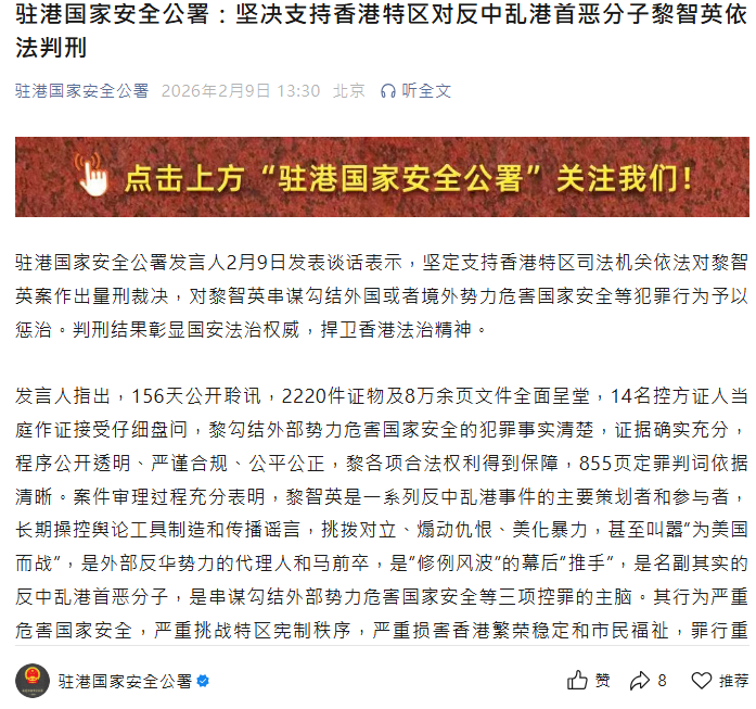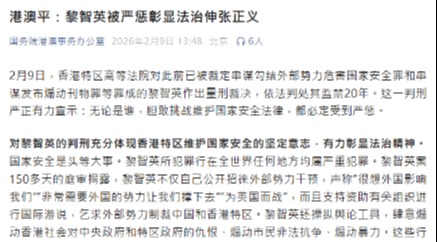 香港新聞網2月9日電 駐港國家安全公署發言人2月9日發表談話表示,堅定支持香港特區司法機關依法對黎智英案作出量刑裁決,對黎智英串謀勾結外國或者境外勢力危害國家安全等犯罪行為予以懲治。判刑結果彰顯國安法治權威,捍衛香港法治精神。