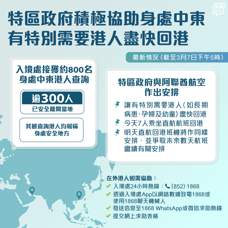 香港新聞網3月7日電 香港特區政府“添馬台”社交媒體賬號7日發佈,特區政府繼續積極為身處中東當地的港人提供協助。截至7日下午5時,入境事務處共接獲約800名身在中東地區的港人查詢,包括最新航班及行程安排,當中超過300人已安全離開當地,其餘查詢港人均報稱身處安全地方。