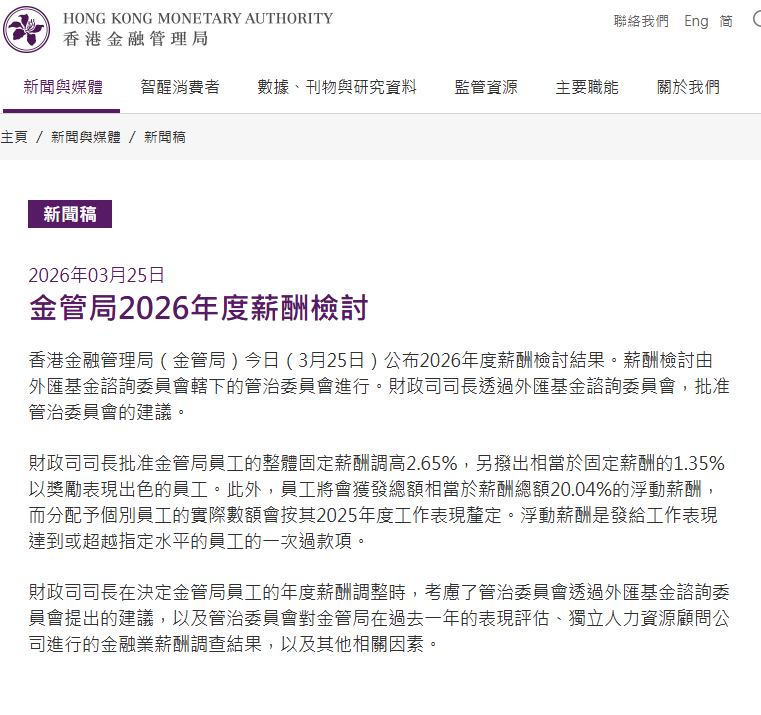 香港新聞網3月25日電 香港金融管理局25日公布2026年度薪酬檢討結果。薪酬檢討由外匯基金諮詢委員會轄下的管治委員會進行。財政司司長透過外匯基金諮詢委員會,批准管治委員會的建議。