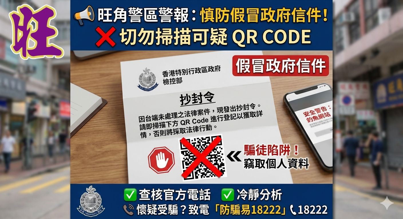 香港新聞網4月19日電 香港近日出現新型騙案,有市民收到懷疑偽裝成政府部門公文的詐騙信件。警方提醒市民慎防假冒政府信件,切勿亂掃 QR Code。 現時不少市民已習慣透過二維碼支付交易,卻未料可能落入詐騙陷阱。旺角警區近日在社交平台發文表示,近期有街坊反映收到懷疑詐騙信件,這些信件偽裝成政府部門公文,內容提及“檢控部”及“抄封令”。 旺角警區提示核實身份:政府部門一般不會透過掃描信件上的 QR Code 要求提供個人敏感資料或進行轉賬;保持冷靜:收到可疑法律文件時,應先根據官方渠道(如政府網頁)查詢相關部門的聯絡電話,並直接致電核實;切勿亂掃:不要隨便掃描來歷不明的 QR Code,防止手機被植入惡意程式或進入釣魚網站;分享資訊:轉發貼文給身邊的老人家及親友,提醒他們提防受騙。
