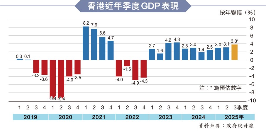 受出口上升及內部需求持續擴張帶動,香港第三季經濟表現蓬勃。特區政府統計處31日公佈預先估計數字,第三季本地生產總值按年實質增長3.8%,高於市場預期增長3%,按季升0.7%。