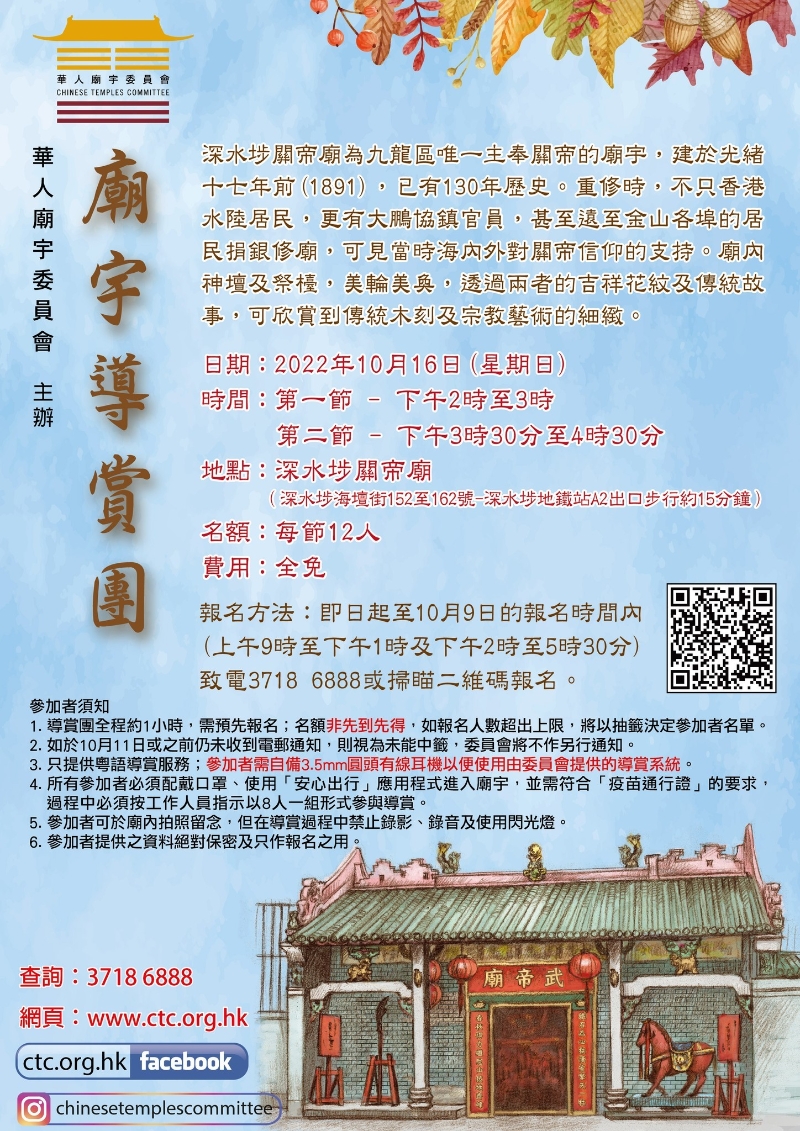 活動詳情: 日期:2022年10月16日(星期日) 時間:第一節 - 下午2時至3時 第二節 - 下午3時30分至4時30分 地點:深水埗關帝廟 (深水埗海壇街152至162號-深水埗地鐵站A2出口步行約15分鐘) 名額:每節12人 費用:全免 【編輯:刘春】
