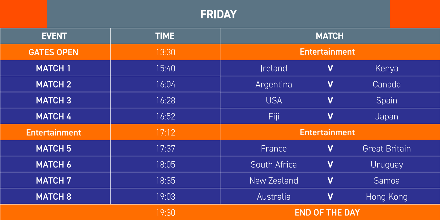 今日比賽安排。(香港國際七人欖球賽官網圖片) 2019年決賽隊伍法國將於首日下午5時37分碰上英格蘭,而在主場勇往直前的港隊在同日尾場遇上力爭衛冕系列賽寶座的澳洲。