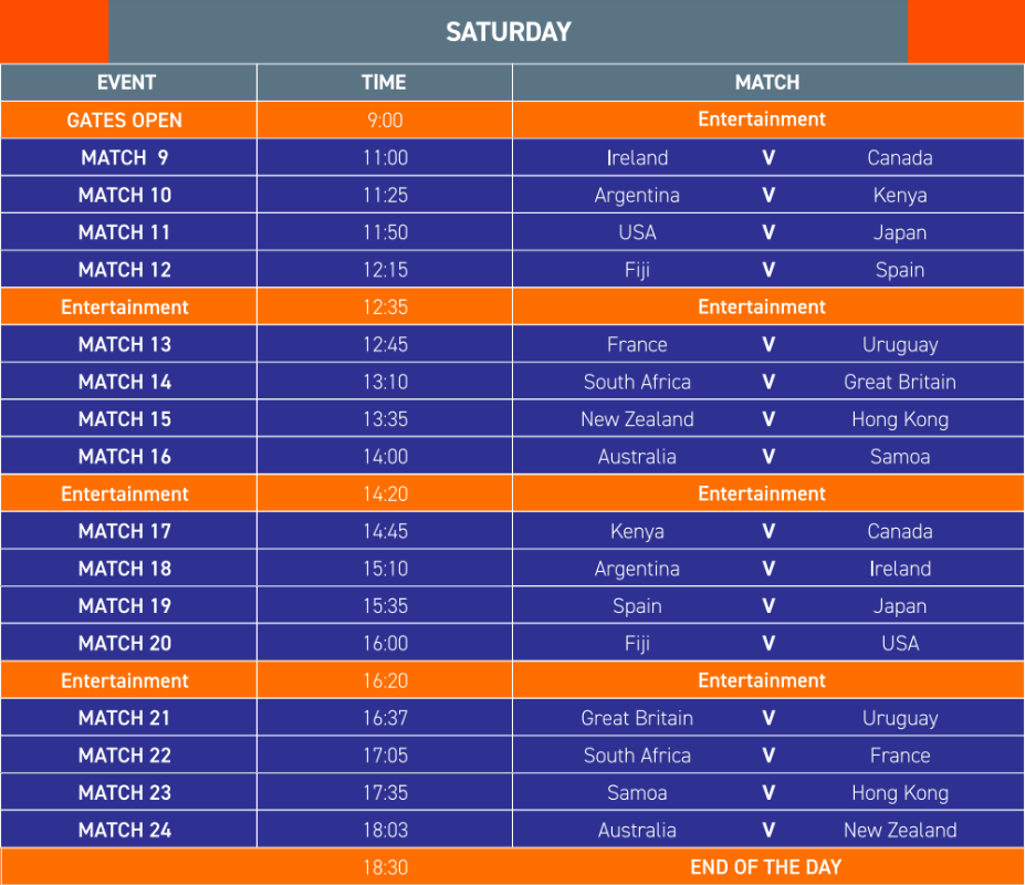 周六比賽安排。(香港國際七人欖球賽官網圖片) 周六的賽程更加激烈,南非與英格蘭短兵相接(下午1時10分),港隊與新西蘭於下午1時35分切磋,周六尾場(晚上6時03分)由澳洲和新西蘭上演“南半球大戰”。