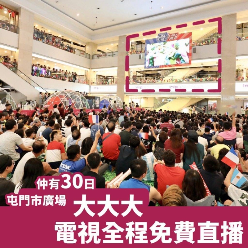 圖片來源:奧海城 4. 屯門市廣場 屯門市廣場也與NOW TV合作,直播64場賽事。屯門市廣場擁有全港商場最大的540吋4K大電視,超高清畫質直播,球迷可以欣賞到每個入球時刻!屯門市廣場於指定場次特設“Beauty Me”專區,提供球隊應援美甲、彩繪、按摩服務及享用睇波急救護膚品等,女生也能投入足球賽事!