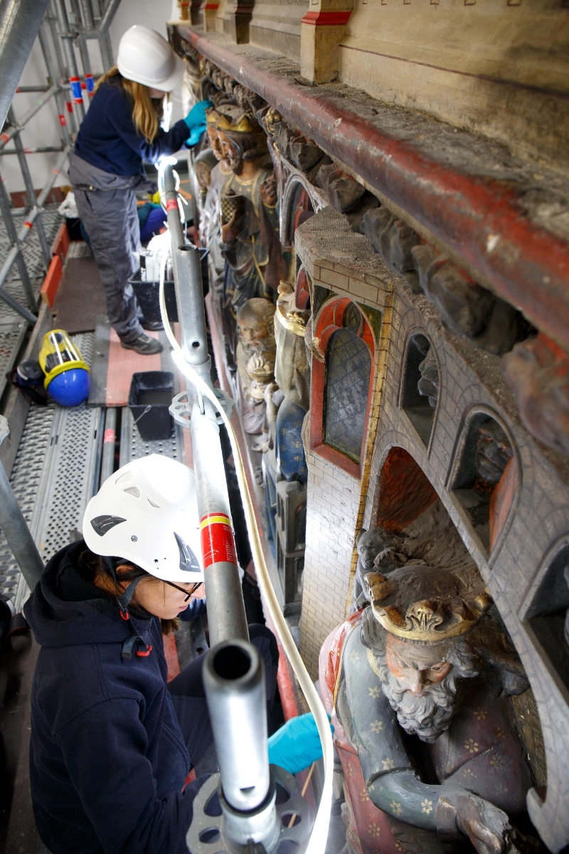 已經完成的木質拱頂等待安裝(圖片:David Bordes攝/巴黎聖母院重建工作組) 而今年夏天在教堂空地上安置的雕塑車間已經開始投入使用,除了修復破損的部分雕塑,進駐的工作組也將負責在車間裡復制出全新的雕塑以代替那些已經徹底損毀的雕像。目前,工作小組正在努力復刻教堂拱頂交叉處的4個小天使。 除了教堂的外部結構,聖母院內部近4.2萬平米的內牆,教堂內的彩繪玻璃窗,壁畫,以及24個小禮拜堂也將被專業的工作人員一一清潔,等到修復工作徹底結束的時候,這座建築就相當於是從裏到外徹底洗了個澡。