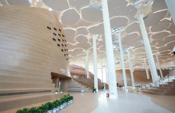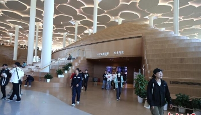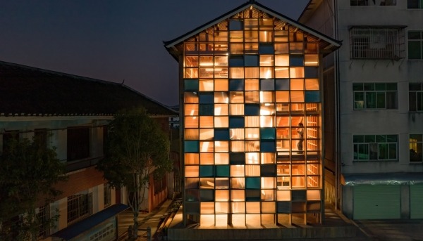 坪坦書屋夜景(圖片:趙賽攝) 坪坦書屋位於湖南省坪坦鄉侗族村一所有400多名學童的小學庭院內,於2021年底開幕。這棟建築物樓高三層,面積約180平方米,完全以木材建造。它沒有分間樓層和房間,而是由兩個交錯的螺旋樓梯組成,形成了一個垂直通道,可供兒童坐下閱讀。