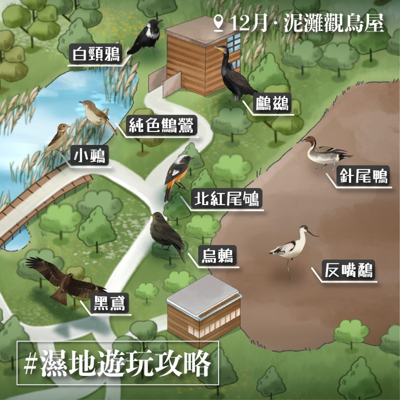 (圖片:香港濕地公園Facebook) 冬天正值候鳥到訪濕地公園的季節。除了紅葉,訪客更可以欣賞到各式各樣的雀鳥,當中包括反嘴鷸、白頸鴉、北紅尾鴝等等。