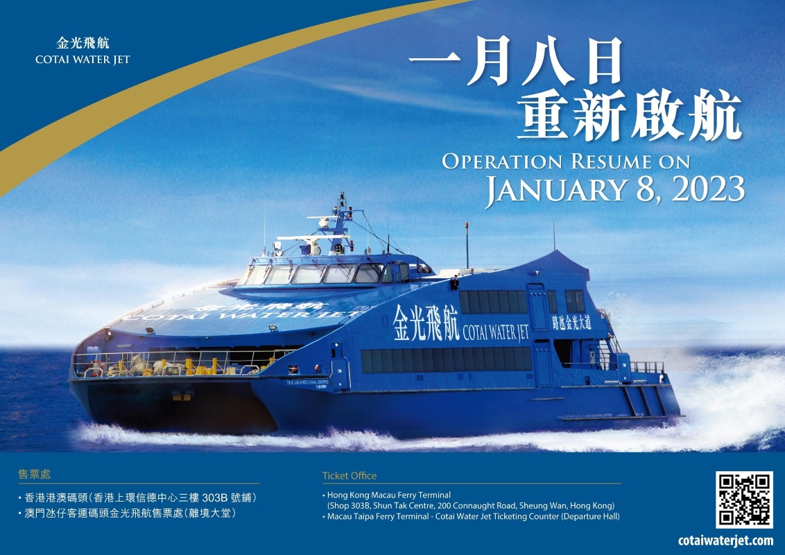 香港新聞網1月6日電 香港與澳門近來終於恢復免檢疫入境安排。隨著澳門較早前宣佈,多間經營港澳渡輪航綫的船公司宣佈復駛港澳航綫。當中,金光飛航宣佈復駛上環港澳碼頭至澳門氹仔航線,而噴射飛航亦公佈了復航詳情。