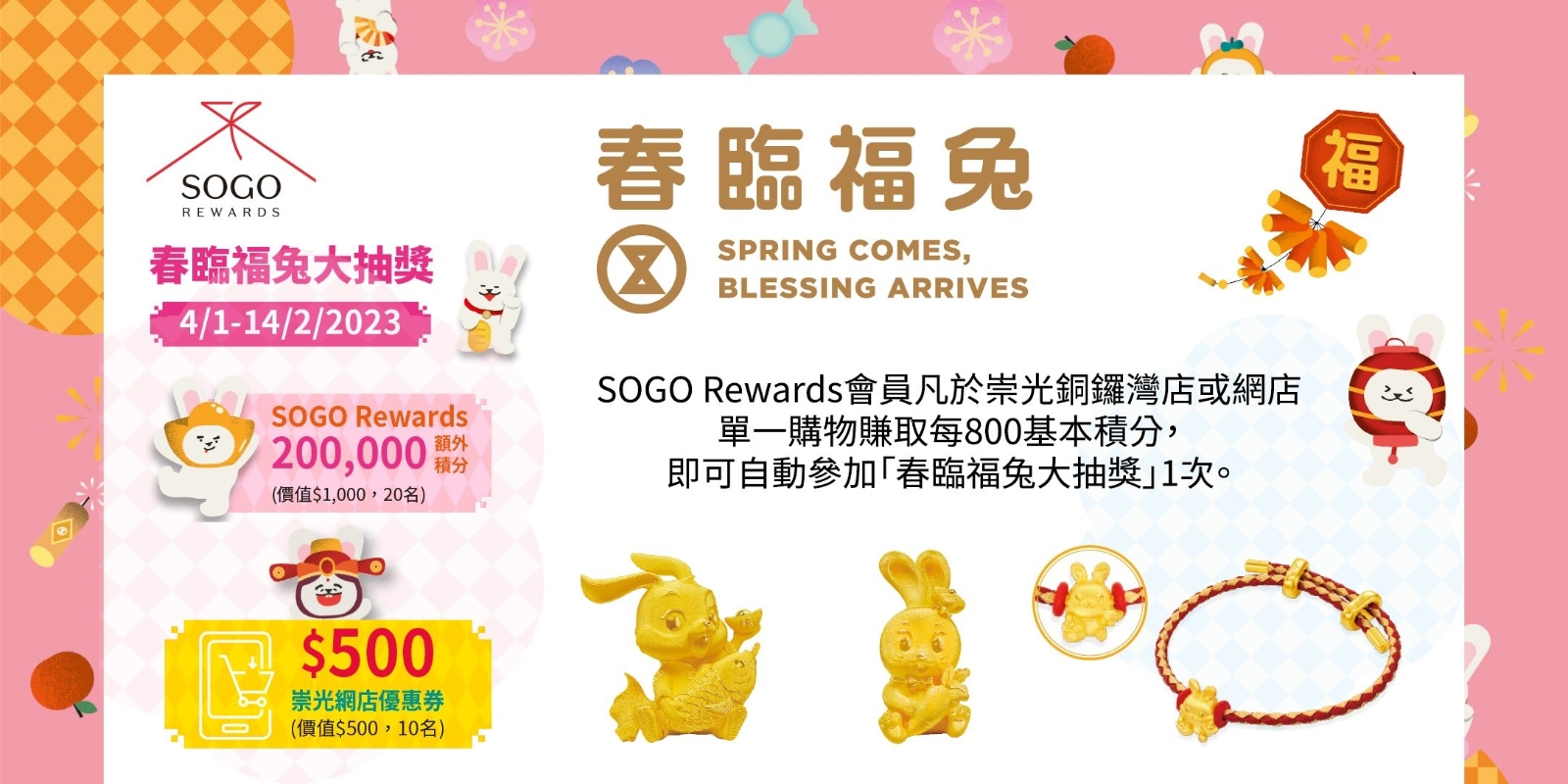SOGO會員購物賺積分兼參加大抽獎 由即日起至2月28日期間,憑指定中國銀行信用卡逢星期五、六、日及公眾假期於崇光百貨簽賬, 可享高達15%現金回贈。 由即日起至1月21日期間, SOGO Rewards會員可以低至3折積分換購POINTASTIC獎賞,包括The Glenlivet、Shiseido、Tom Ford等尊貴禮品。 凡於崇光銅鑼灣店或網店單一購物賺取每800基本積分,即可自動參加“春臨福兔大抽獎”一次,有機會赢取周大福“金兔迎福”生肖系列足金擺件、SOGO Rewards 200,000額外積分及HK$500崇光網店優惠券等獎品。 美麗華集團