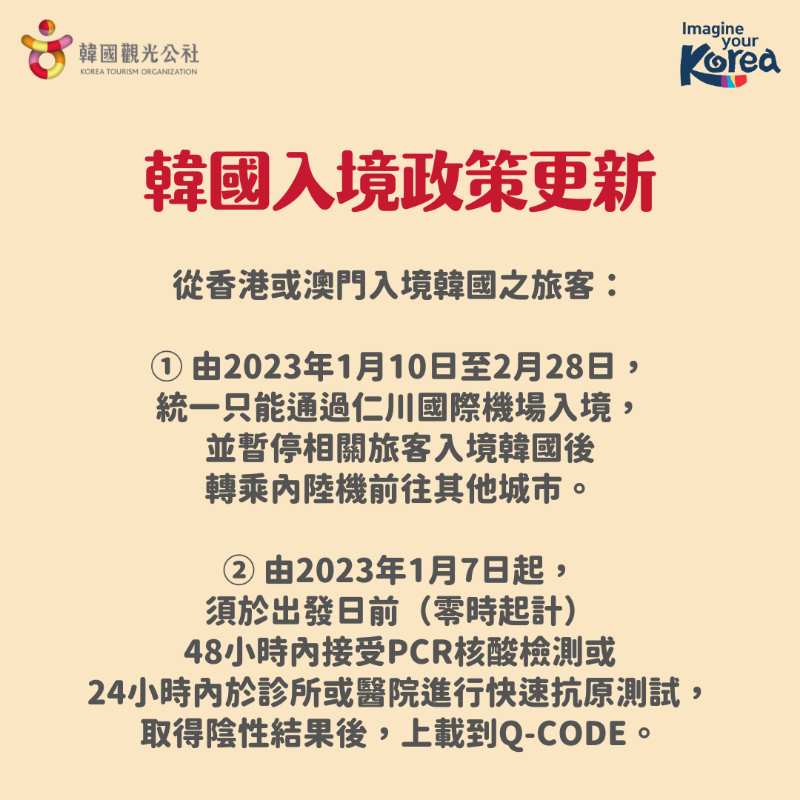 根據大韓民國駐香港總領事館,從香港或澳門入境韓國之旅客: ① 由2023年1月10日至2月28日,統一只能通過仁川國際機場入境,並暫停相關旅客入境韓國後轉乘內陸機前往其他城市。 ② 由2023年1月7日起,須於出發日前(零時起計)48小時內接受PCR核酸檢測或24小時內於診所或醫院進行快速抗原測試,取得陰性結果後,上載到Q-CODE。 【編輯:黃璇】