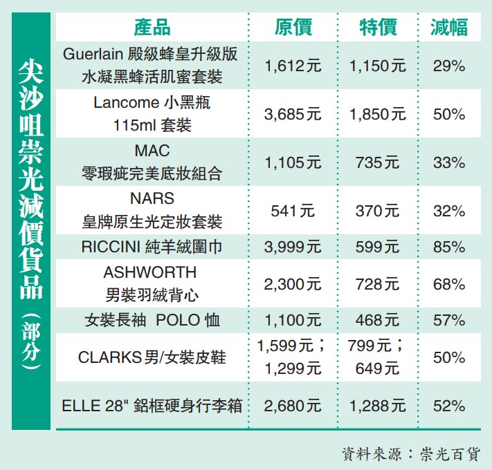 香港新聞網1月11日電  SOGO崇光百貨尖沙咀店將於3月12日結業,並由即日起進行清貨減價,一系列精選美妝品、男女服裝、首飾、百貨減價低至5折!