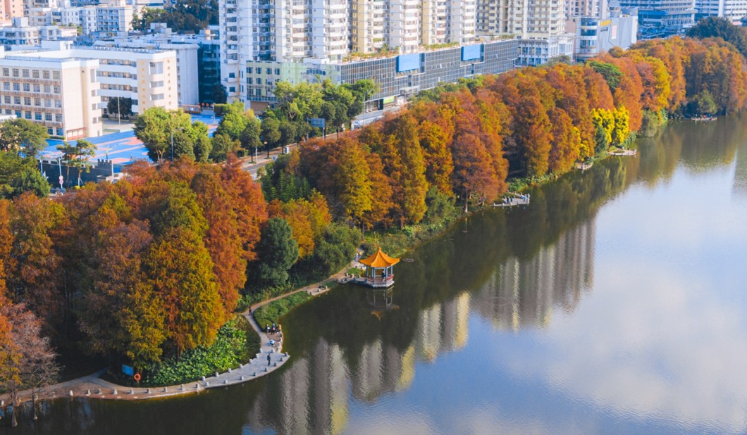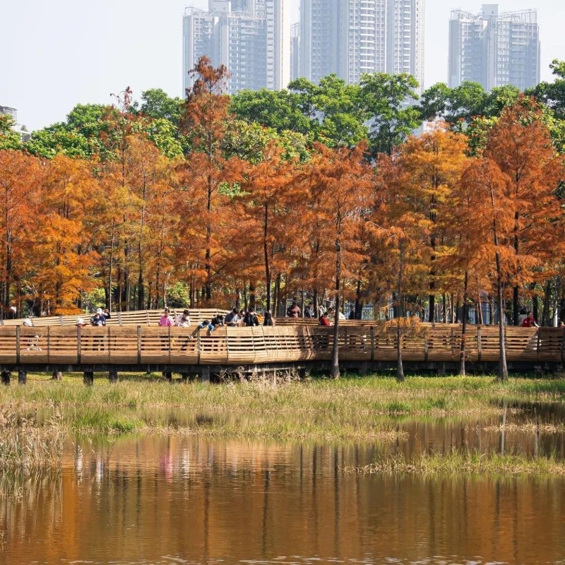 深圳中心公園(圖片:深圳生活研究所) 深圳中心公園 地址:廣東省深圳市福田區紅荔路373號 如何前往:乘搭深圳地鐵3號線/7號線至“華新”站 5)洪湖公園 連綿洪湖2公里的落羽杉,也紅得恰到好處。從洪湖公園東側門進入,往左步行約10分鐘就能收獲一大片落羽杉。無論是遛娃還是相約朋友一起前來,走在林間小路上感受這美好風光都是極致享受。熱烈如火的葉子配上温暖的橘黃陽光,對孩子來說是踏入童話世界;對於深圳人來說,則是在忙碌外的片刻悠然。