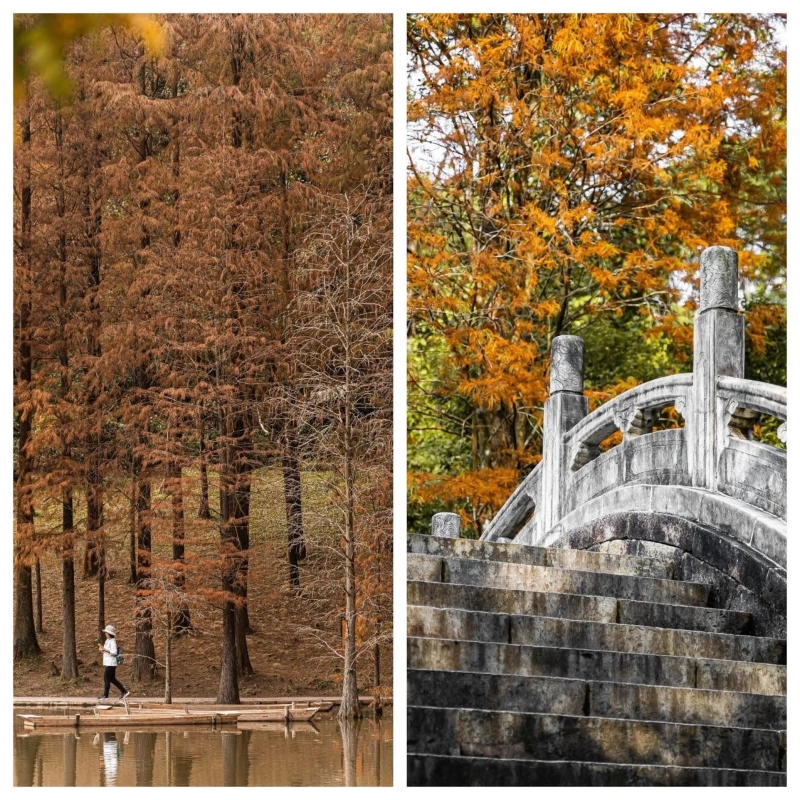 仙湖植物園(圖片:深圳生活研究所) 仙湖植物園 地址:廣東省深圳市羅湖區仙湖路160號 如何前往:乘搭深圳地鐵2號線至“仙湖路”站 3)泰華梧桐島 泰華梧桐島有大片的落羽杉,在秋風的洗禮下,漸是秋色,層林盡染。寧靜的湖面映射著紅杉,疊翠流金,仿佛訴說著所有關於秋冬的美好。信步於木橋間、草叢間,都可以與田園貓、小白兔和大鵝在這裏不期而遇。悠然自得,甚至還能偶遇一隻遇你而開屏的花孔雀。