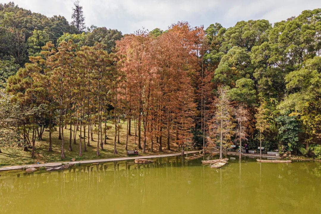 蓮花山公園(圖片:深圳生活研究所) 蓮花山公園 地址:廣東省深圳市福田區紅荔路6030號 如何前往:蓮花山公園交通方便,多條地鐵可以到達。乘搭深圳地鐵3號線/4號線至“少年宮”站;地鐵2號線至“蓮花西”站。 2)仙湖植物園 仙湖植物園的落羽杉冬日裏也是數一數二的美好。可以趁著新年祈福,來逛逛這片絕美的落羽杉湖景。落羽杉沿著水生園湖岸點片交織,在藍天碧水映襯下色彩斑斕,暈染出絕美冬色。不同的角度,每一棵樹甚至每一個側面,都是不同層次的紅。移步換景間,屬於落羽杉的童話故事正向你娓娓道來。