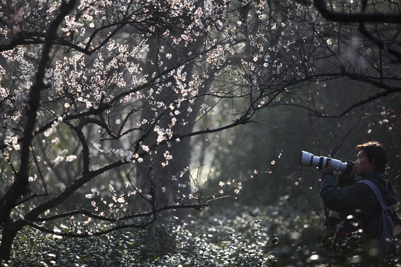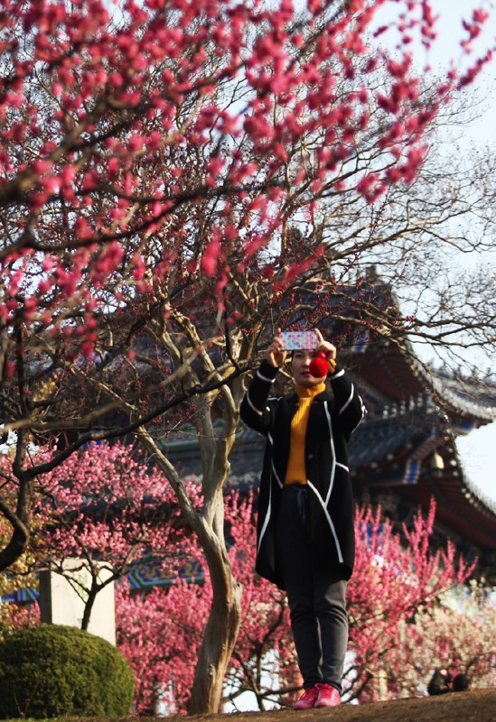 遊客在梅花山拍照(圖片:新華社) 除了猶如仙境般的“梅花海”,位於明孝陵正門的臘梅同樣備受矚目。淡黃色的臘梅仿佛點點星光灑落在朱紅色的牆壁上,梅樹上停靠著一對可愛的愛情鳥,頓時形成一幅唯美的風景畫。