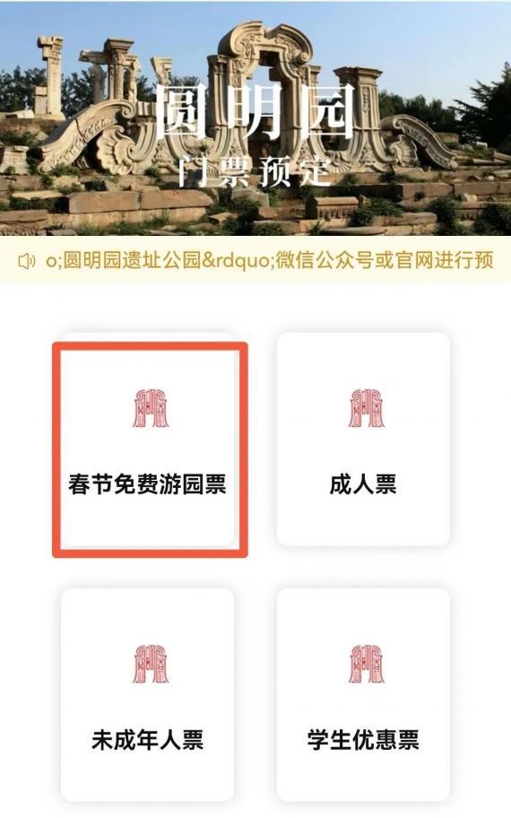 香港新聞網1月18日電 春節期間,圓明園將於1月21日至1月27日發放20萬張圓明園通票(含圓明園門票、西洋樓遺址區門票和全景模型展門票),遊客可由即日起通過圓明園遺址公園微信公眾號進行預約,1月21日(除夕)可預約免費票2萬張,1月22至27日(年初一至初六)每天可預約免費票3萬張,如遊客已購買春節期間的門票,可以通過購買渠道進行退票,預約免費門票;若新春遊園免費票約滿後,需購買門票。(馬首展也可預約免費門票,選擇對應日期的免票即可) 註:60歲以上人士及政策性免票人員持有效證件入園,無需預約。入園時間:上午7時至下午5時30分 預約流程 1)進入“圓明園遺址公園”微信公眾號→點擊頁面下方“預約”→門票預約