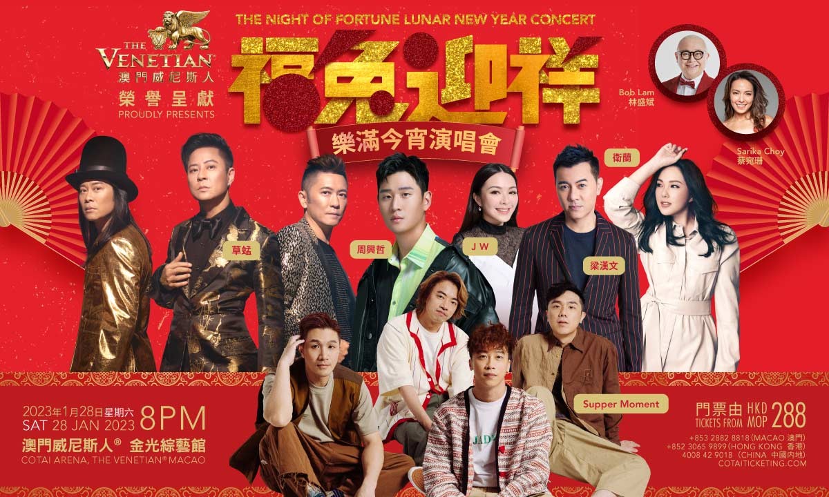 香港新聞網1月26日電 今個星期六1月28日(年初七),“福兔迎祥——樂滿今宵演唱會”將於澳門威尼斯人金光綜藝館舉行,一眾知名歌手齊齊唱旺瑞兔年,讓樂迷大飽耳福。 “福兔迎祥——樂滿今宵演唱會”精心呈獻一場流行樂視聽盛宴,為新春更添喜氣。可容納萬人的金光綜藝館為觀眾帶來難忘的新春體驗,在動聽旋律中迎接大展宏“兔”的新一年。演唱會陣容星光熠熠,包括周興哲、草蜢樂隊、衛蘭、JW、Supper Moment及梁漢文將登台獻藝,唱響新年。