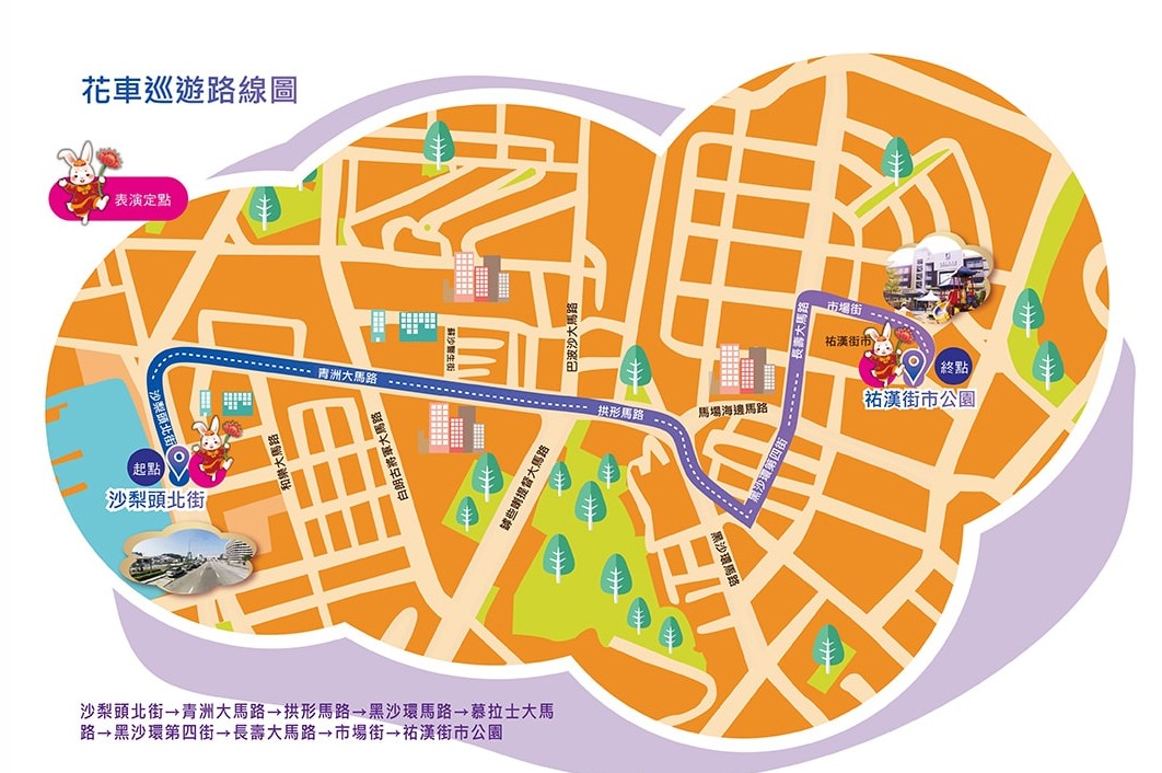 農曆新年花車匯演(圖片:澳門旅遊局) 倘若錯過年初三花車匯演,沒關係,年初七(1月28日)晚上有花車匯演第二場,詳情如下: 2023年1月28日(年初七),星期六,晚上8時至9時30分 巡遊路線: 沙梨頭北街→青洲大馬路→拱形馬路→黑沙環馬路→慕拉士大馬路→黑沙環第四街→長壽大馬路→市場街→祐漢街市公園 文藝表演地點: 晚上8時15分,祐漢街市公園