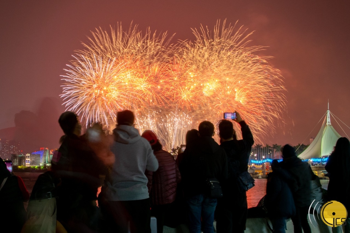 煙花在澳門旅遊塔對出海面綻放(圖片:澳門新聞局)