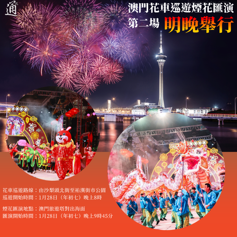 花車巡遊第二場路線圖 而“歲歲平安——絢麗澳門煙花匯演”第二場,亦將於當晚上演,詳情如下: 2023年1月28日(年初七),星期六,晚上9時45分 煙花燃放地點: 澳門旅遊塔對出海面