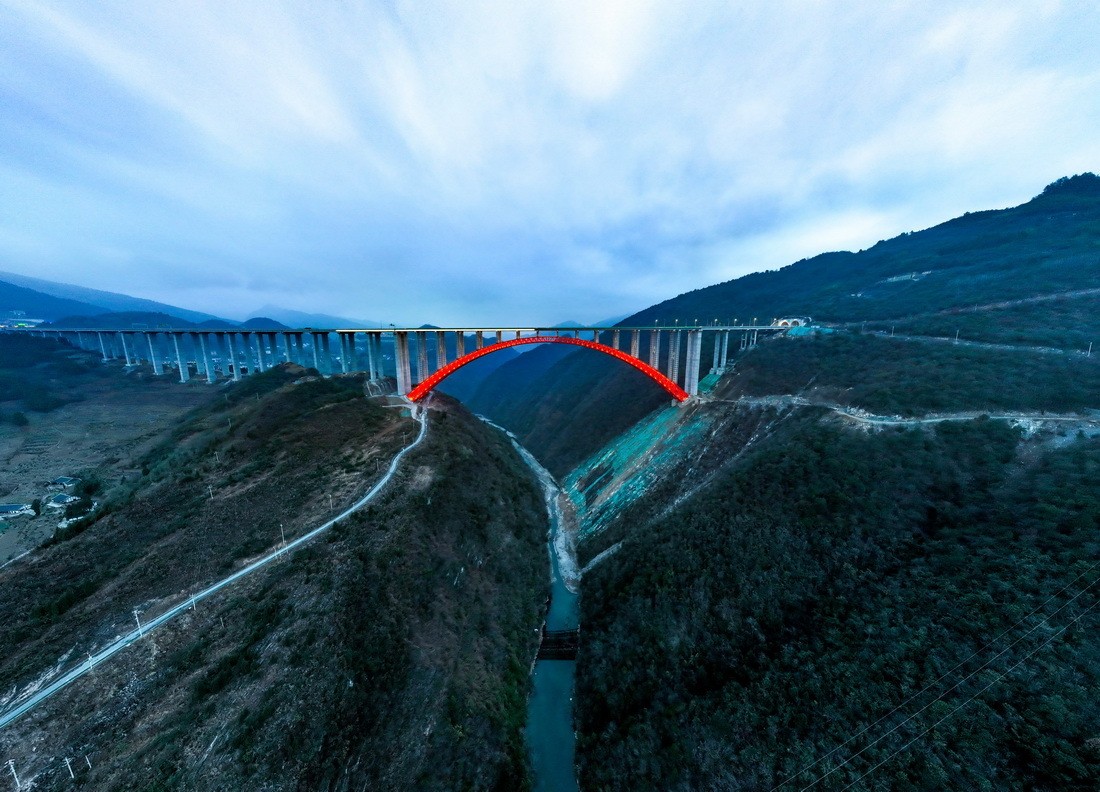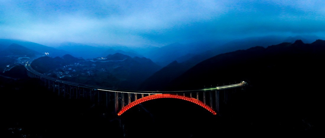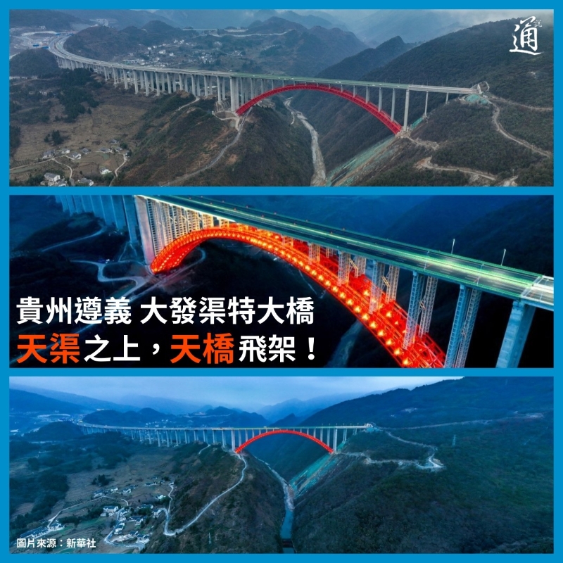 香港新聞網2月8日電 貴州被譽為“中國橋梁博物館”,世界高橋前100名中,近一半在貴州,一座座架設在高山峽谷間的世界級大橋,讓天塹變通途。貴州遵義市“大發渠特大橋”全長1427米、主跨410米、橋寬33米,是仁遵高速公路(貴州仁懷至遵義)的控制性工程之一。