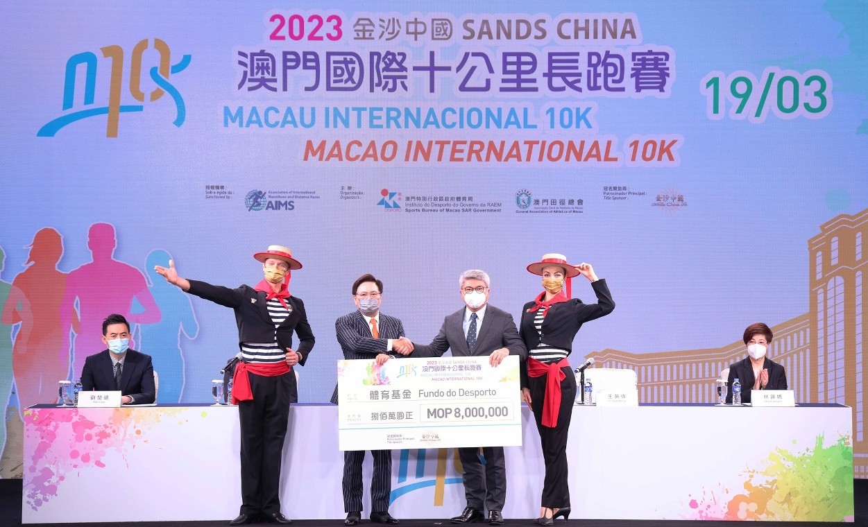 金沙中國有限公司再次成為賽事冠名贊助商 賽事組委會在新聞發佈會中,正式宣佈金沙中國有限公司再次成為本年“澳門國際十公里長跑賽”的冠名贊助商。澳門特區政府體育局局長潘永權及金沙中國有限公司總裁王英偉在新聞發佈會上進行支票遞交儀式,贊助金額為澳門元捌佰萬圓正。出席新聞發佈會的嘉賓還包括:澳門田徑總會副理事長陳步倩、澳門特區政府體育局副局長劉楚遠及林蓮嬌、以及體育委員會委員等。