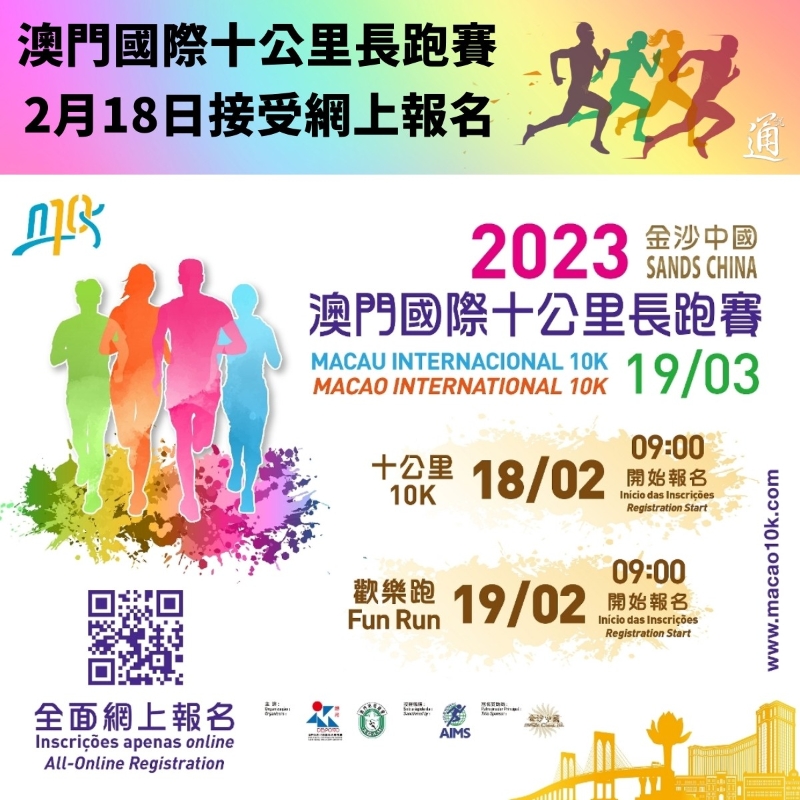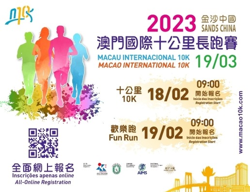 香港新聞網2月9日電 由澳門特區政府體育局及澳門田徑總會舉辦的“2023金沙中國澳門國際十公里長跑賽”將於3月19日舉行。賽事分為十公里及歡樂跑(約五公里)兩個比賽項目,提供合共10,000個報名名額,並將於2月18日(十公里)和2月19日(歡樂跑)開始接受報名。