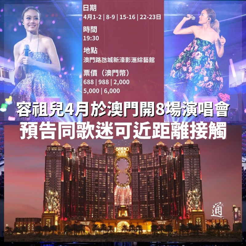 容祖兒4月1日起於澳門開騷(製圖:黃璇) 容祖兒提起澳門不亦樂乎,特別是澳門美食,她說想起就想吃:“非常喜歡食葡國菜、水蟹粥、椒鹽粟米、豬仔包等,想起就流口水。之前我曾跟Twins一齊來過拍MV,在(新濠影滙)8字型摩天輪取景,非常好玩。”