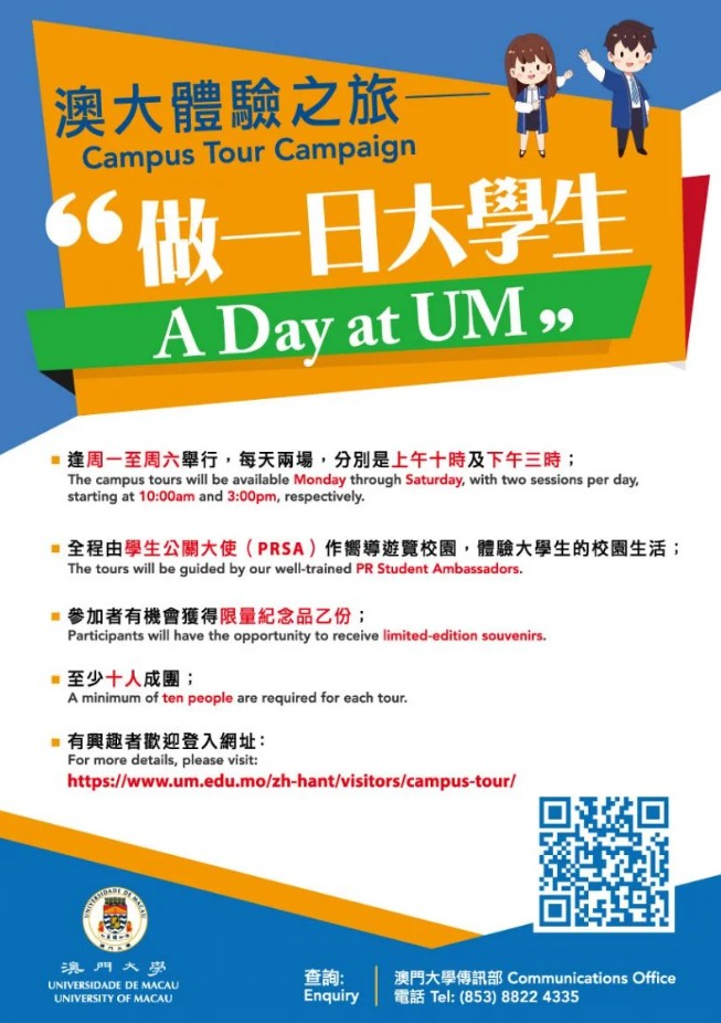 “做一日大學生”體驗澳大生活(圖片:澳門大學) 澳大校園面積約1.09平方公里,與澳門氹仔島一河相連,背倚蔥綠秀美的橫琴山,整體規劃強調“以人為本”、“環境育人”,為師生提供適宜學術思考、充滿田園及樸素學術特色的育人環境。在澳大學生公關大使的帶領下,參加者可深入大學展館、圖書館、書院等地方“做一日大學生”,一邊欣賞校園美景一邊了解澳大和澳大人的故事;活動還設有互動遊戲,參加者更有機會獲得限量紀念品一份。活動結束後,參加者還可以選擇在校園裏的餐廳用餐。 “做一日大學生”體驗之旅逢星期一至六進行,每天兩場,分別為10:00-11:30和15:00-16:30,每場時間約1.5小時,導賞語言涵蓋廣東話、普通話或英語,有10個人便可組團參加,報名可登入澳大訪客專頁:www.um.edu.mo/zh-hant/visitors,點擊校園導賞的“做一日大學生”體驗之旅,或直接連結校園導賞專頁:shorturl.at/glr58。查詢可致電:+853 8822 4335,或電郵至:prs.campus_tour@um.edu.mo。