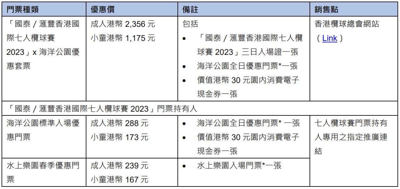 香港新聞網3月8日電 香港國際七人欖球賽(七欖)將於3月31日至4月2日舉行,一連三天上演動感澎湃和令人目不暇給的賽事。香港海洋公園和水上樂園與香港欖球總會(欖總)推出聯乘優惠,由今日(3月8日)起至4月2日,訪客可於香港欖球總會網站購買“國泰 / 滙豐香港國際七人欖球賽2023” x 海洋公園優惠套票。已持有球賽門票的人士,則可由香港欖球總會發布的指定推廣連結,選購海洋公園和水上樂園優惠門票。